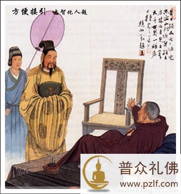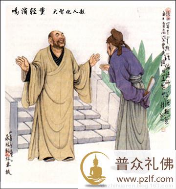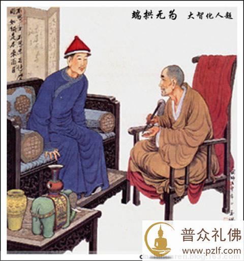 赵州王前往拜访赵州从谂禅师,从谂禅师并未出迎,坐在禅床上会见他,并且先问: “你明白我的意思吗?” “不明白。”赵州王回答。 禅师见赵州王未明其意,于是,转而解释说:“自小持斋身已老,见人无力下禅床,请别见怪。” 赵州王非但不见怪,反而对从谂禅师更加尊重,并于次日派一位将军前往赠送礼品。禅师听说后即下床相迎受礼。事后弟子们不解,就问从谂禅师:“大王来时,你不下床,大王的部下来时,你却下床相迎,这是为什么?” 禅师对弟子们说:“你们有所不知,人分上中下三等,但并非以身份而论。上等人来时,禅床上应对;中等人来时,下禅床接待;末等人来时,要去山门外迎接。” 弟子们言下有悟。