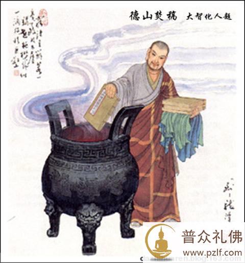 德山禅师本是北方讲经说法的大师,因不满南方禅门教外别传的说法,携带自著的“《金刚经》青龙疏钞”南来抗辩。才到南方就受到一位老婆婆的奚落,自此收敛起狂傲的心,并请问老婆婆,近处有什么宗师可以前去参访?老婆婆告诉他在五里外,有一位龙潭禅师,非常了得。 德山禅师到了龙潭,一见龙潭禅师就迫不及待的问道:“这是什么地方?” 龙潭禅师回答道:“龙潭!” 德山禅师逼问道:“既名龙潭,我在此巡回,既不见龙,又不见潭,这是何故?” 龙潭禅师就直截了当地告诉德山禅师:“你辛苦了,你已到了龙潭!” 这天夜里,德山向龙潭禅师请益,站在龙潭禅师座前久久不去。龙潭禅师说道:“夜已很深,你为何还不下去!” 德山道过晚安,告辞回去,走到门口,又再回来,说道:“外面实在太黑,学僧初到,不知方向。” 龙潭禅师就点燃了一支蜡烛给他,正当德山伸手来接时,龙潭禅师又把蜡烛吹灭了。德山忽然大悟,立刻跪下来,向龙潭禅师顶礼。 龙潭禅师问道:“你见到了什么?” 德山禅师回答道:“从今以后,我对天下所有禅师的舌头,都不会再怀疑了。” 第二天,德山禅师将自己写的疏钞拿到堂前当众焚烧。当火焰燃起时,他吟唱道:“穷诸玄辩,若一毫致于太虚;竭世枢机,似一滴投于巨壑。”