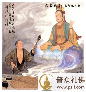 文喜禅师朝拜五台山,一日傍晚,途中经金刚窟般若寺,遇见一位牵牛的老翁。 文喜问:“请问长者,可否借宿一晚?” 老翁答道:“你有执着心,不能留你住。” 文喜解释说:“我没有执着心。” 老翁问:“你受戒了吗?” 文喜答:“早都受过戒了。” 老翁说:“既然没有执着心,还用得着受戒吗?” 文喜禅师无言以对,作礼告退。再回头时,老翁与寺都已消失得无影无踪,抬头却见文殊菩萨乘金毛狮子在五色云中款款飘游。后来,文喜前往洪州观音寺向仰山禅师参学,契悟心要,并担当寺里的煮饭工作。一日,厨房的蒸汽中忽然显现出文殊菩萨的形象,文喜举起勺子便打,并说道:“文殊自文殊,文喜自文喜,岂能乱我心。” 文殊菩萨风趣地说:“苦瓠连根苦,甜瓜彻蒂甜,修行三大劫,却被这僧嫌。”