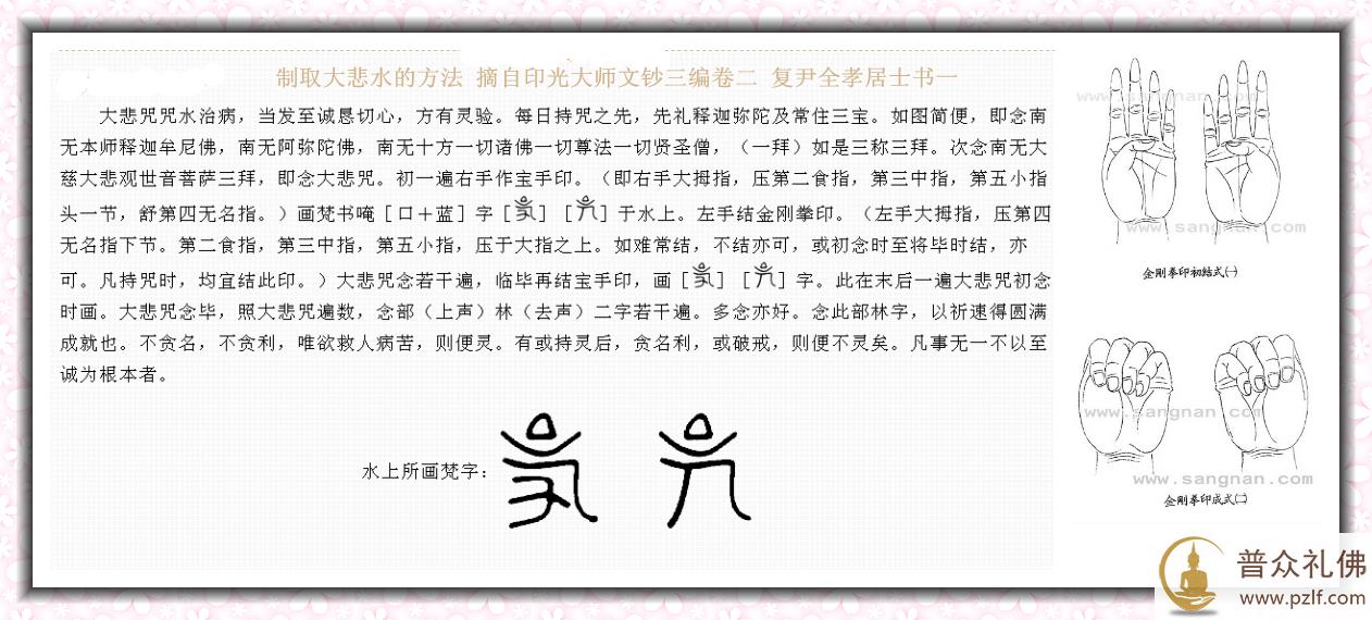 复尹全孝居士书一 (摘自印光大师文钞三编卷二) 大悲咒咒水治病,当发至诚恳切心,方有灵验。每日持咒之先,先礼释迦弥陀及常住三宝。如图简便,即念南无本师释迦牟尼佛,南无阿弥陀佛,南无十方一切诸佛一切尊法一切贤圣僧,(一拜)如是三称三拜。次念南无大慈大悲观世音菩萨三拜,即念大悲咒。初一遍右手作宝手印。(即右手大拇指,压第二食指,第三中指,第五小指头一节,舒第四无名指。)画梵书唵[口+蓝]字[